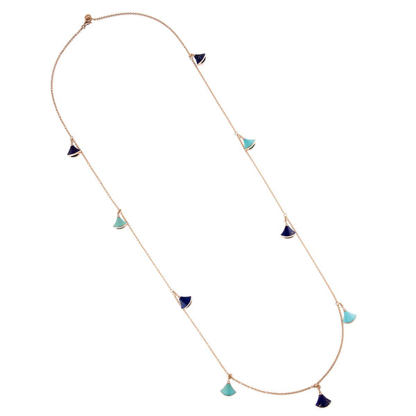 Pomellato necklaces carry the Milanese house’s distinctive approach to colored gemstones — large, lightly polished stones in rose-cut cuts that emphasize depth and transparency over conventional brilliance. Nudo pendant necklaces with prasiolite, amethyst, and sky blue topaz drop stones set in a minimal rose gold prong are among the most collected Italian jewelry necklace designs on the secondary market. M’ama Non M’ama daisy chain necklaces in 18-karat rose gold with multicolored petal stones represent a more accessible Pomellato format.