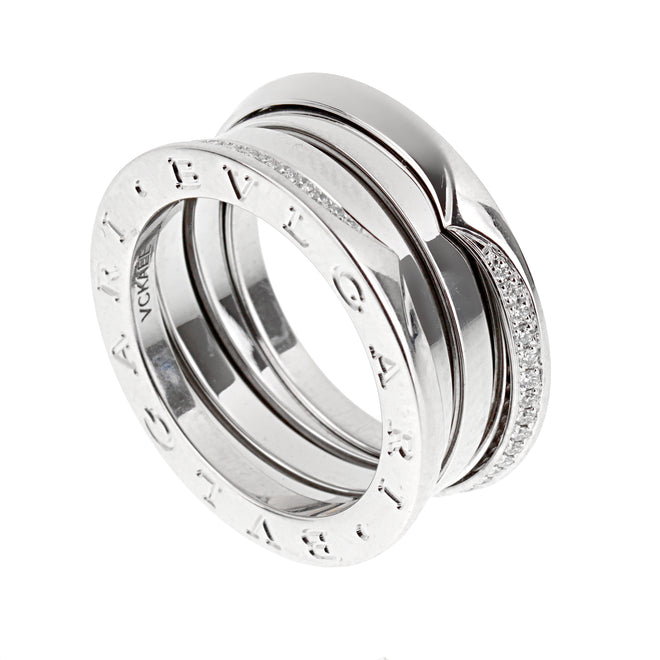 The Bvlgari B.zero1 three-band ring in 18k white gold is a modern interpretation of the brand’s most recognizable architectural design. Inspired by the sweeping, structural lines of Roman landmarks, the ring is defined by its sculptural silhouette and the signature spiral form that has become synonymous with the B.zero1 collection. This version introduces demi-pavé diamonds along the outer edges, adding controlled sparkle that highlights the curves without overwhelming the clean, contemporary profile.
