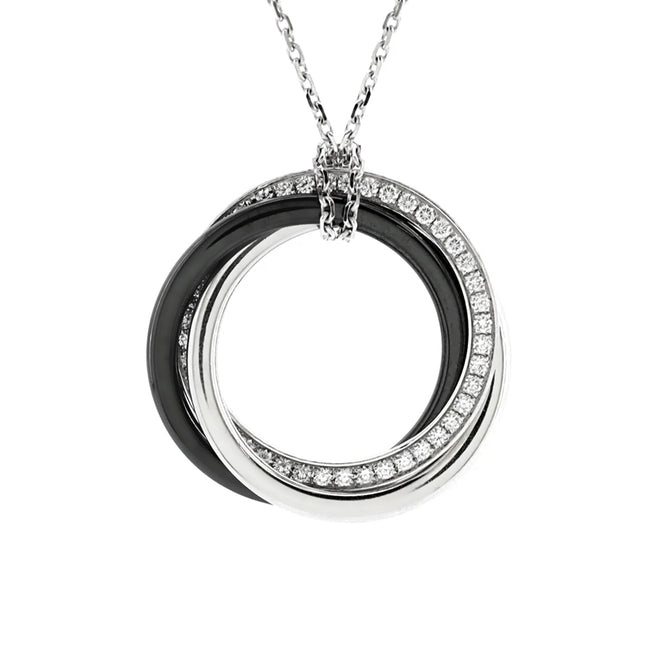 Expertly crafted in 18k white gold, the pendant features three interlocking rings that move gracefully with each motion, creating a sculptural composition that feels both architectural and fluid. One band is mirror-polished to a high shine, embodying Cartier’s signature elegance and mastery of precious metalwork. The second ring is beautifully inlaid with smooth, high-gloss black ceramic — a modern material known for its durability and deep, reflective luster. The third ring is exquisitely pavé-set with brilliant-cut white diamonds totaling approximately 0.20 carats, each stone meticulously selected for its exceptional color and clarity. The diamonds shimmer subtly yet commandingly, adding a touch of radiant sophistication to the minimalist design.