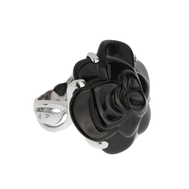 Chanel Camellia Large Onyx 18k White Gold Cocktail Ring Sz 5 1/2