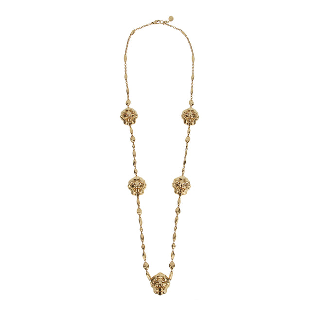 Measuring an 28 inches in length and weighing a substantial 89 grams, this sautoir embodies the essence of Chanel’s bold jewelry designs. The necklace is adorned with five intricately sculpted lion head medallions spaced evenly along a stylized gold link chain. Each lion head is exquisitely detailed, capturing a lifelike expression of nobility and defiance, and drawing the eye with its rich texture and fluid dimension.