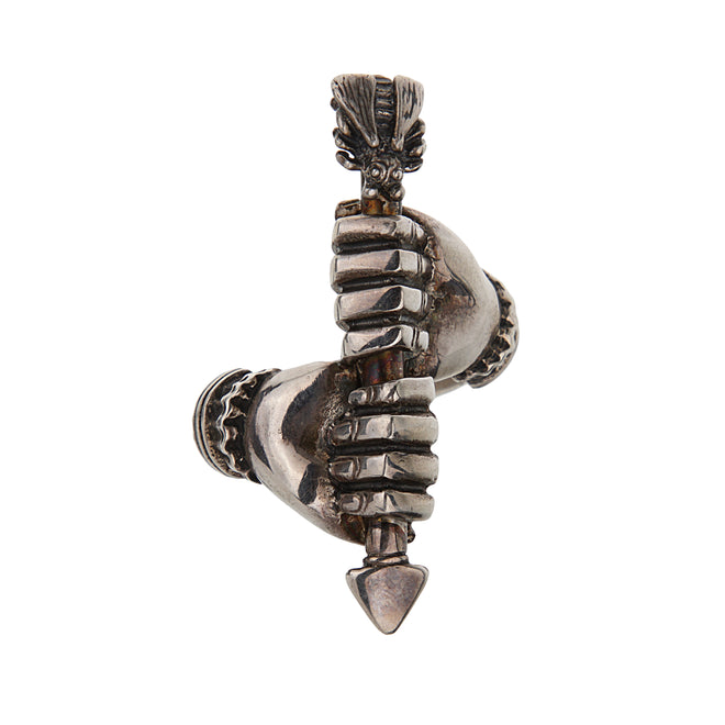 Daring, symbolic, and expertly crafted, this Gucci Sterling Silver Ring is a sculptural masterpiece that embodies the brand’s edgy, avant-garde aesthetic. Designed in the form of two intricately detailed hands gripping a central arrow, the ring evokes themes of strength, unity, and defiance—hallmarks of Gucci’s bold design language.