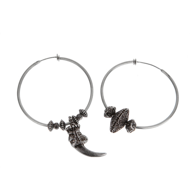 Bold, eclectic, and distinctly Gucci—these Sterling Silver Hoop Earrings offer a daring reinterpretation of classic hoops with an artisanal twist. Each earring features a unique composition of oxidized silver charms, ranging from geometric beads to a prominent claw-like talon pendant crowned with a sculptural motif, creating an intentionally mismatched design.