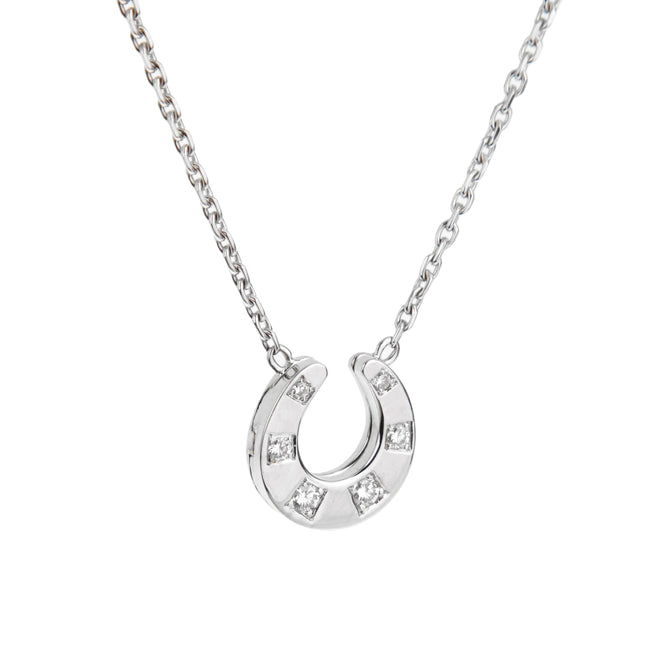 The polished white gold horseshoe is accented with round brilliant diamonds, each expertly set to enhance the clean geometry and subtle curvature of the charm. The diamonds offer a crisp, sparkling contrast against the cool-toned gold, giving the necklace a sophisticated radiance that transitions effortlessly from day to evening.