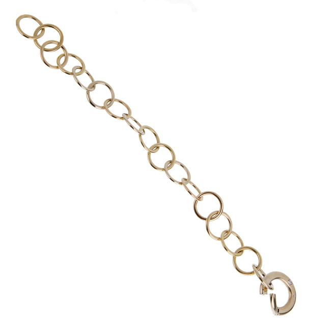 Crafted from 18k white, rose, and yellow gold, the bracelet features interlocking circular links that create a fluid, sculptural pattern around the wrist. The alternating tones of white , rose, and yellow gold highlight the beauty of contrast, allowing the bracelet to pair effortlessly with other jewelry, whether contemporary or vintage. The smooth, polished finish of each link ensures a lustrous glow, catching the light with every movement and enhancing the bracelet’s elegant presence.