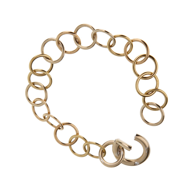 Crafted from 18k white, rose, and yellow gold, the bracelet features interlocking circular links that create a fluid, sculptural pattern around the wrist. The alternating tones of white , rose, and yellow gold highlight the beauty of contrast, allowing the bracelet to pair effortlessly with other jewelry, whether contemporary or vintage. The smooth, polished finish of each link ensures a lustrous glow, catching the light with every movement and enhancing the bracelet’s elegant presence.
