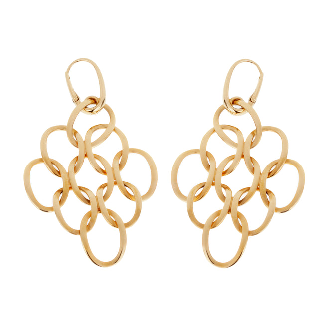 Each earring features a cascading arrangement of oval links, carefully interlocked to form a fluid and airy silhouette. The openwork design creates a lace-like effect with a contemporary twist, allowing light to pass through and casting subtle reflections with every turn of the head. The polished finish enhances the warm glow of the rose gold, adding a soft luster that flatters all skin tones and elevates both casual and formal looks.