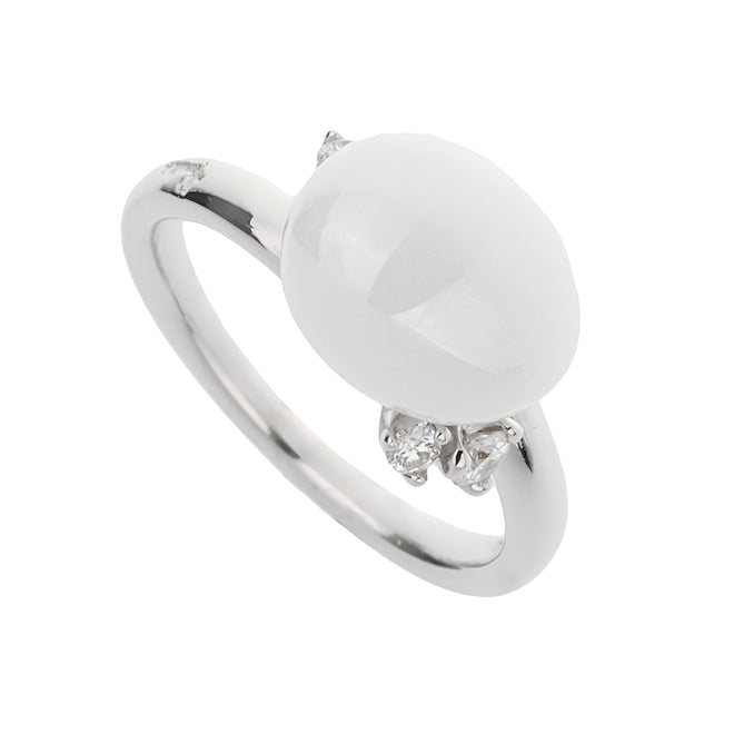 At the heart of this exquisite ring sits a luminous, beautifully polished white agate cabochon. The agate, renowned for its soothing, milky glow, reflects an aura of tranquility and purity, reminiscent of Capri's serene seaside landscapes. Its smooth, rounded shape captures the natural beauty and fluidity of the island’s picturesque scenery, creating an instant focal point that draws the eye and sparks conversation.