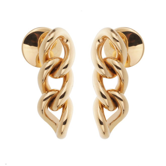 Each earring features a trio of voluptuous, highly polished links that cascade gently from the lobe in a dynamic vertical drop. The design captures the fluidity and softness of a chain, transformed into a sculptural statement piece that feels both contemporary and timeless. The links are slightly graduated in size, creating a natural taper that flatters the face and adds elegant movement with every step.