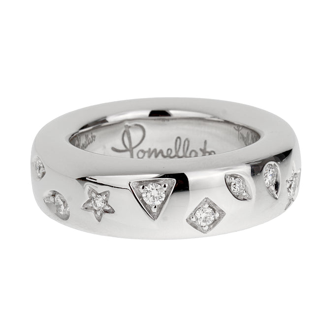 Adorning the ring's surface is an artful display of brilliant-cut diamonds, totaling approximately 0.50 carats. These sparkling diamonds are thoughtfully embedded in various whimsical geometric shapes, including stars, triangles, squares, and teardrops. Each diamond is meticulously set, highlighting Pomellato’s dedication to precision and craftsmanship. The playful arrangement provides a modern twist on traditional diamond rings, making this piece both distinctive and captivating.
