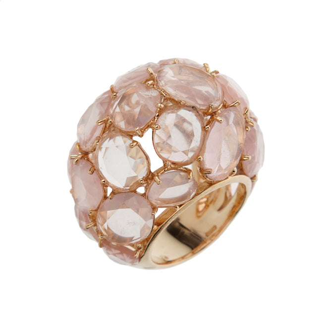 Crafted in luxurious 18k rose gold, the bombe dome silhouette exudes an unmistakable sense of glamour and confidence. Its voluminous form creates a sculptural canvas, elevated by an abundant display of rose quartz gemstones. Known as the stone of love, tenderness, and inner peace, rose quartz radiates a soft, romantic glow that perfectly complements the warm tones of the rose gold setting. The carefully selected stones are rose-cut and arranged in an intricate mosaic across the dome, offering a surface that dances with light and depth.
