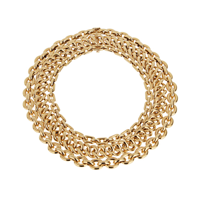 Designed for those who appreciate substantial gold pieces, the necklace features a dramatic 1.57-inch-wide profile, composed of thick, tightly linked rounded chains that drape fluidly around the neck. The craftsmanship is unmistakable—each link is meticulously polished to a mirror-like finish, creating a radiant surface that captures and reflects light with striking intensity. The effect is powerful yet refined, embodying the aesthetic Ralph Lauren Purple Label is revered for: confident, glamorous, and effortlessly elevated.