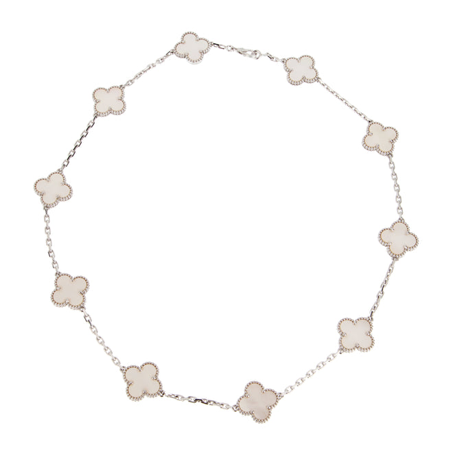 The necklace carries ten individual quatrefoil motifs, each one set with a disc of iridescent white mother-of-pearl cut to the precise silhouette of the clover. The mother-of-pearl is the detail that separates a good Alhambra from a great one. Van Cleef & Arpels hand-selects each piece from the nacre layer of the oyster shell for uniformity of color, consistency of sheen, and absence of surface imperfection — and the result is a row of ten stones that shift from pale silver to soft champagne to faint pink depending on how the light moves across them. No two motifs are ever identical, which is the point.